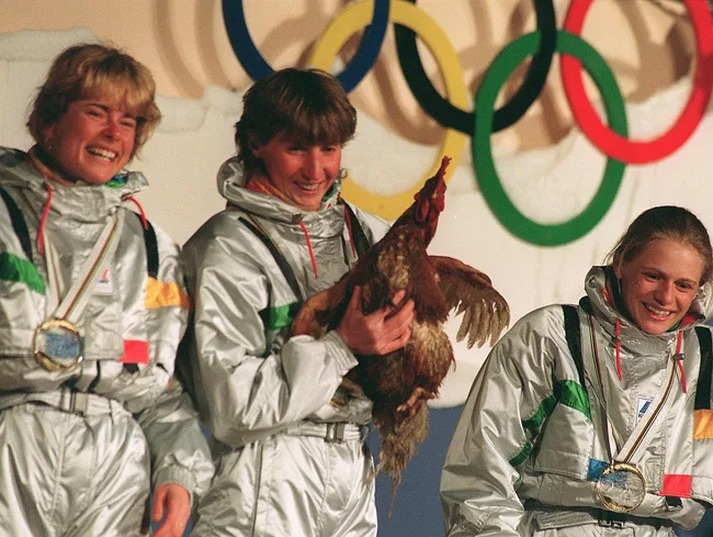 The French Biathlon team receive the gold medal in 1992. Photo: AFP/Getty Images