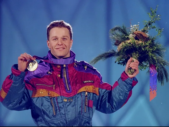 Andreas Schönbächler of Switzerland wins gold for Freestyle Aerial Skiing in 1994 in Lillehammer, Norway. Photo: Clive Brunskill/Allsport