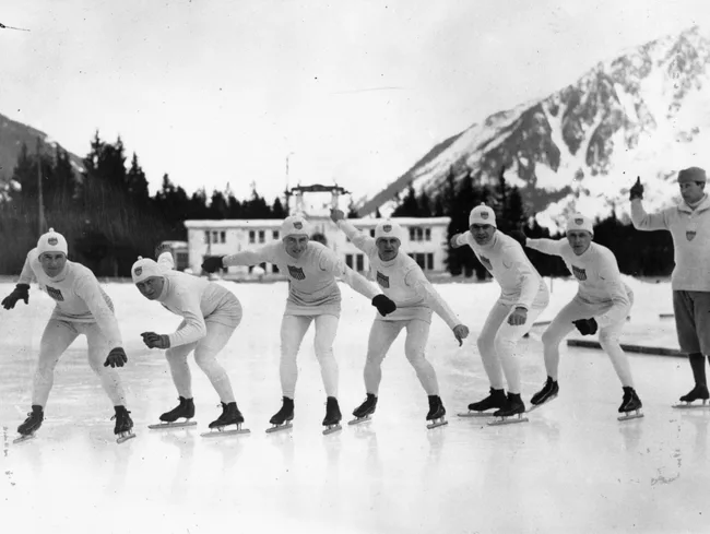 American skaters practising for the 1924 Winter Olympics at Chamonix. Photo: Topical Press Agency/Getty Images