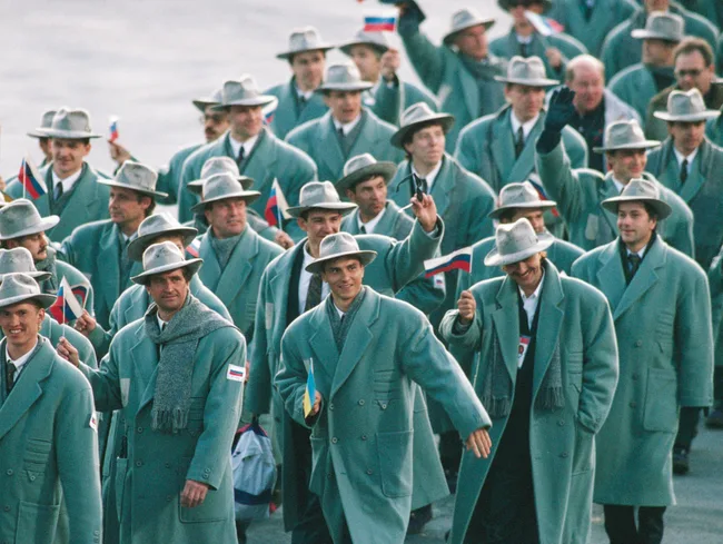 The Russian team at the opening ceremony in Albertville, France in 1992.