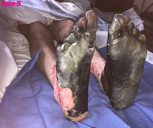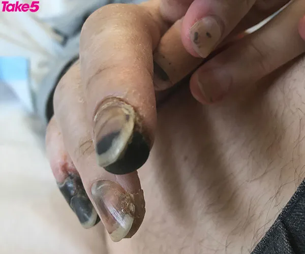 The tips of my right finger and thumb, along with my toes, had been cut off from blood supply and turned black. Doctors would try to save my legs but it depended on how the tissue regenerated, as it was already dead.