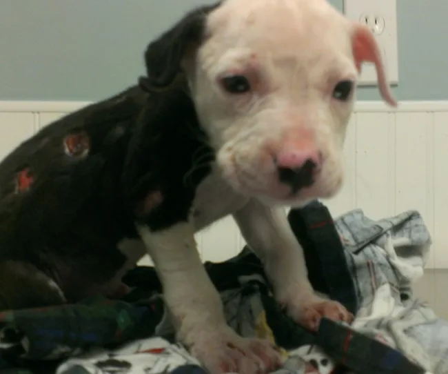 “Jake was rescued from a burning shed by a local firefighter. He was abandoned by his family at the vet shortly after.”