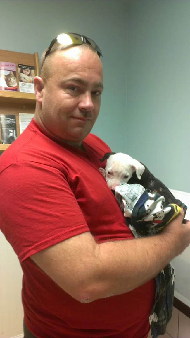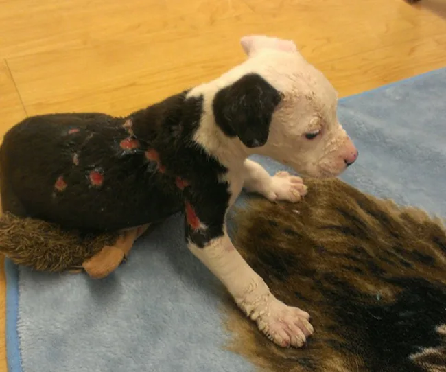 Tiny Jake was rescued from a burning shed by a local firefighter.