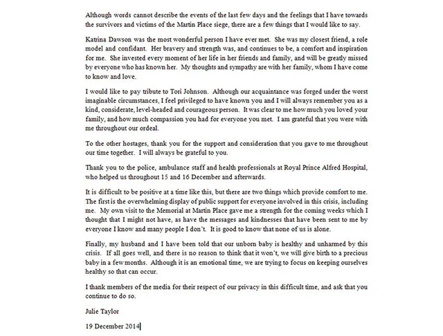 Sydney siege survivor Julie Taylor has released a statement praising Katrina Dawson and Tori Johnson for their bravery.