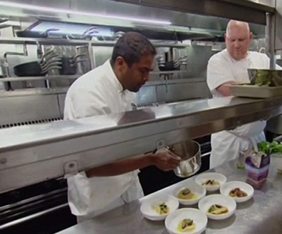 Monty attempted to advise the contestant against the dish, but Sashi persisted, only to cave to the pressure of the pro kitchen and the presence of chef Monty watching over his efforts.