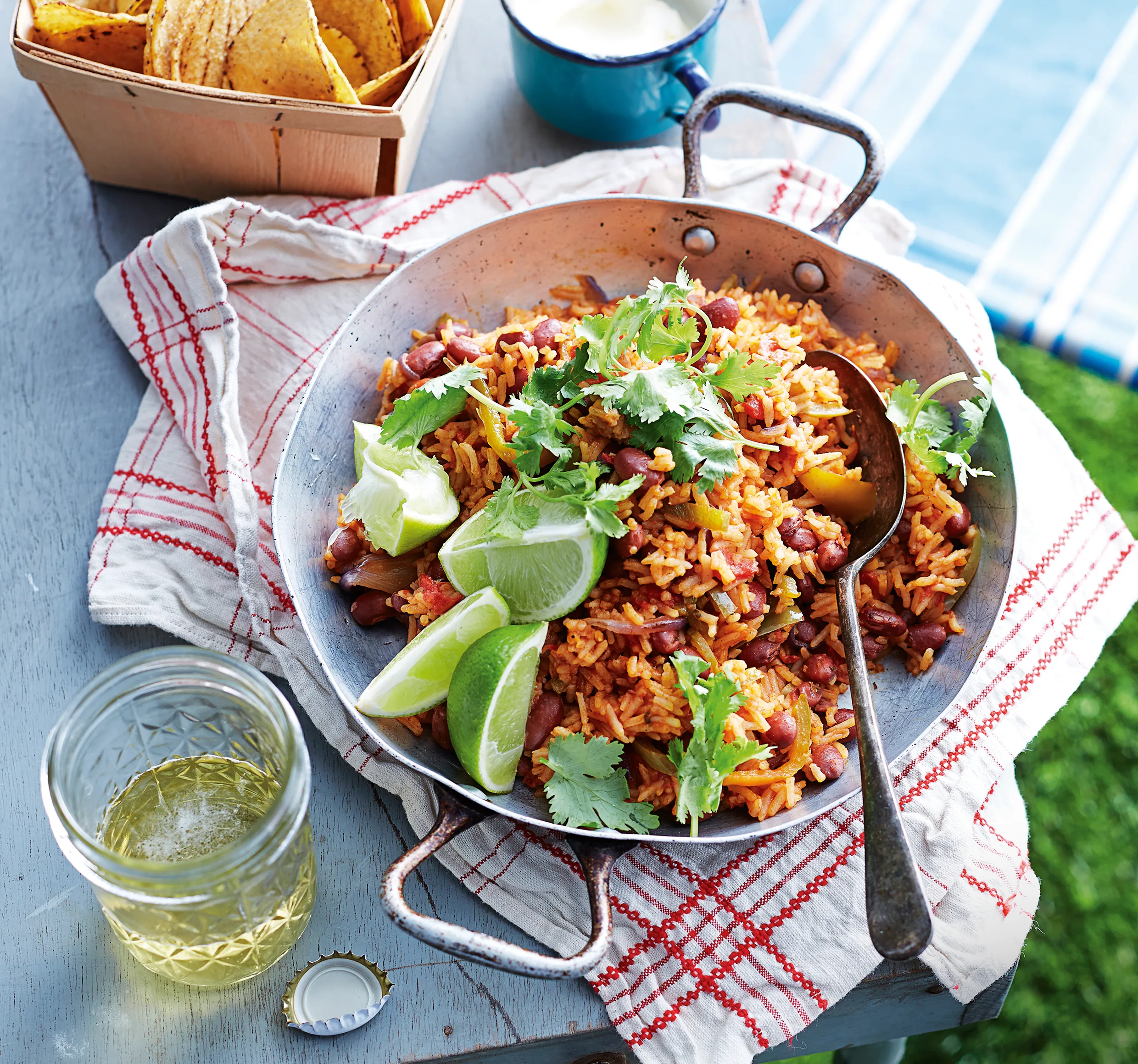 Top with coriander. Serve with corn chips, sour cream and lime wedges.