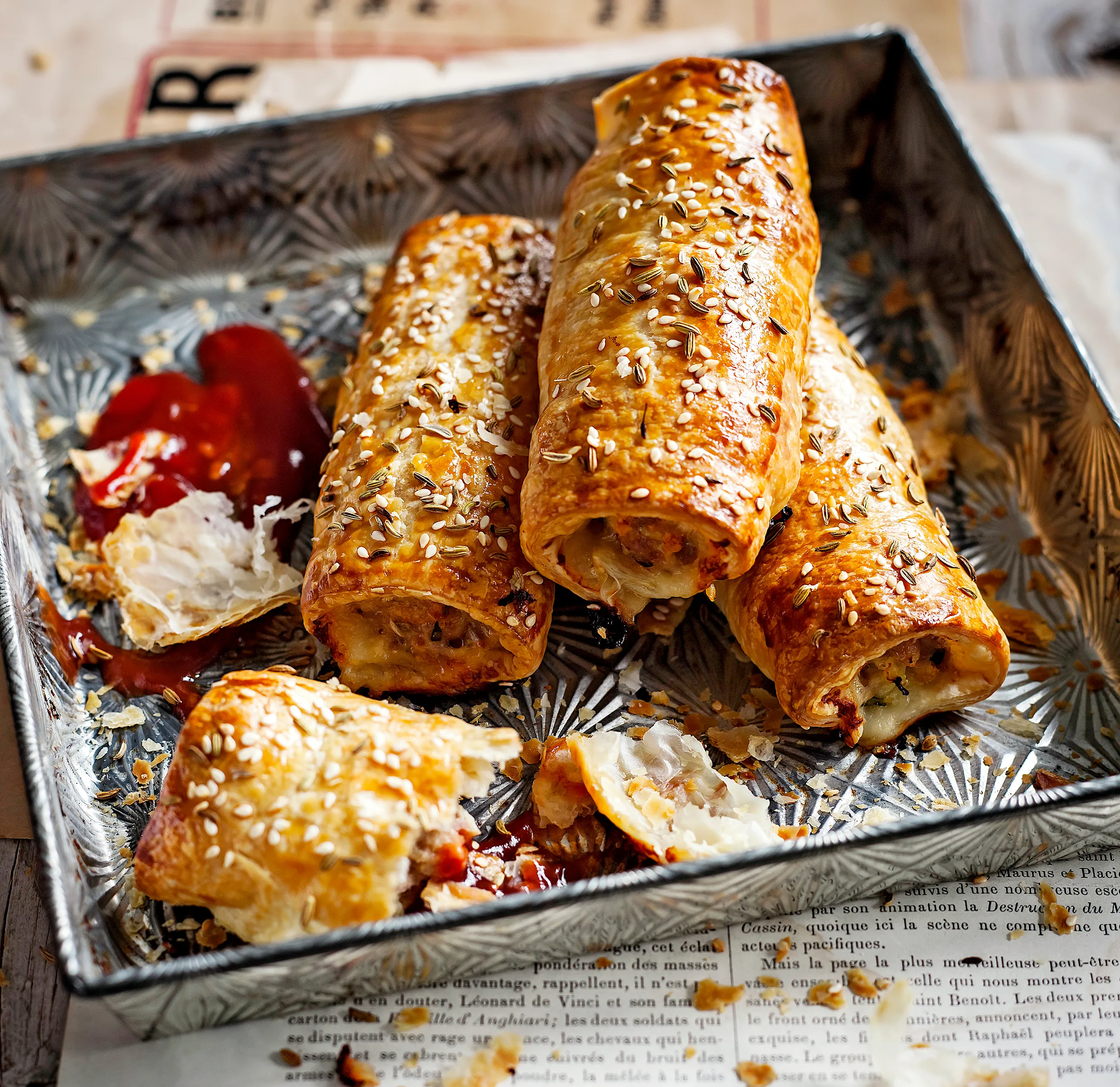 Cut pastry sheets into four squares. Place about ½ cup of mixture along one side of one square. Roll to enclose. Place, seam-side down on a baking-paper-lined tray. Repeat with rest of pastry.