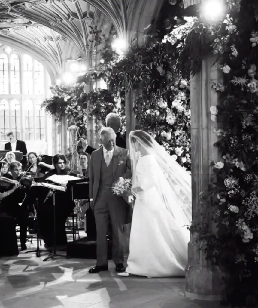 A small, black-and-white portrait of Charles walking Meghan down the aisle on her wedding day in 2018 sat in prize position at the very front of the side table.