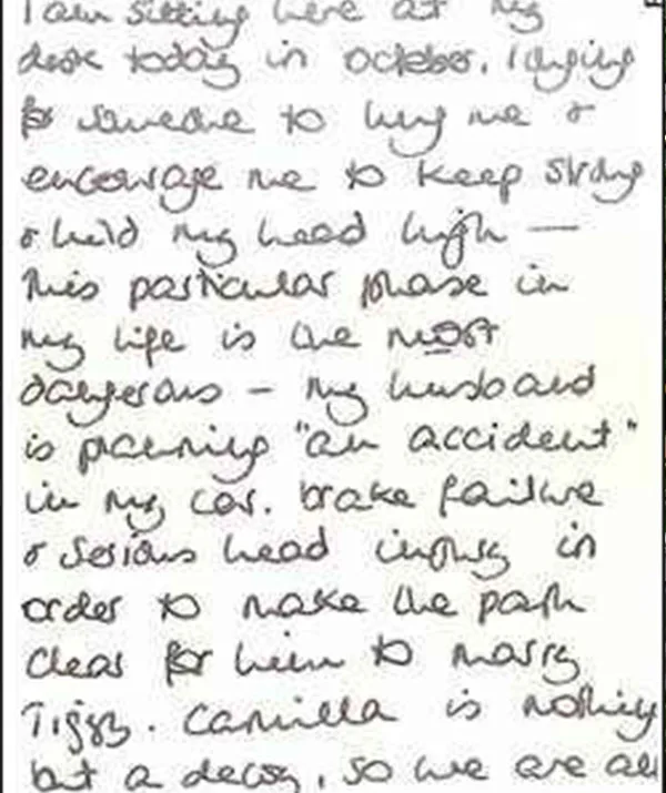 “This particular phase in my life is the most dangerous. My husband is planning ‘an accident’ in my car, brake failure or some serious head injury in order to make the path clear for him to marry Tiggy [William and Harry’s nanny]. Camilla is nothing more than a decoy so we are being used by the man in every sense of the word.”