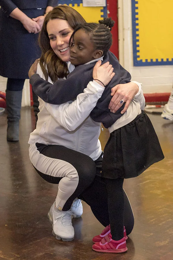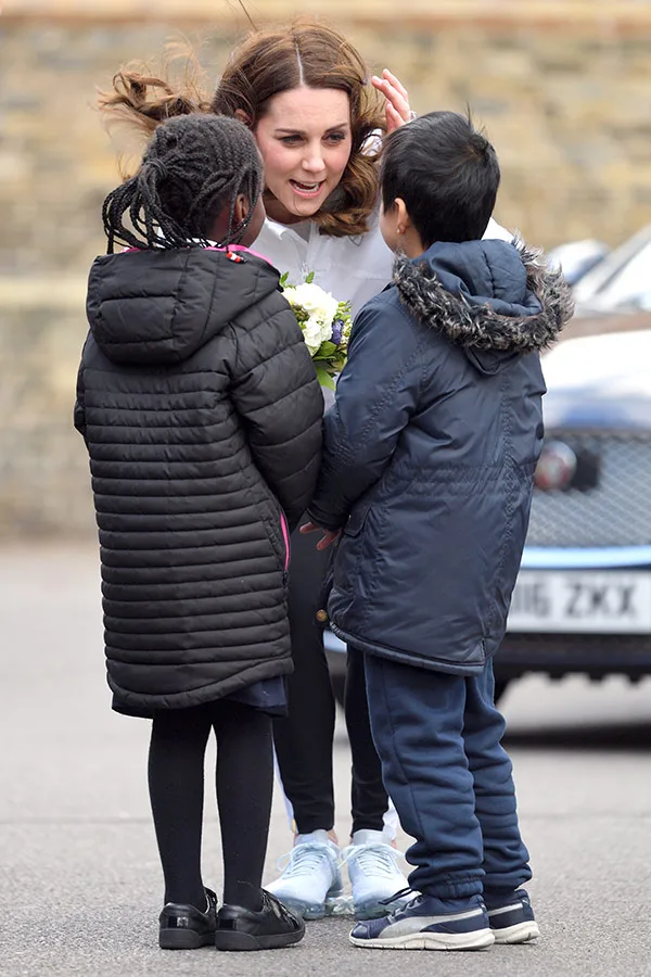 Throwing royal protocol out the window, Kate showed off her maternal side when she gave all the little ones big cuddles instead of the usual royal handshakes.