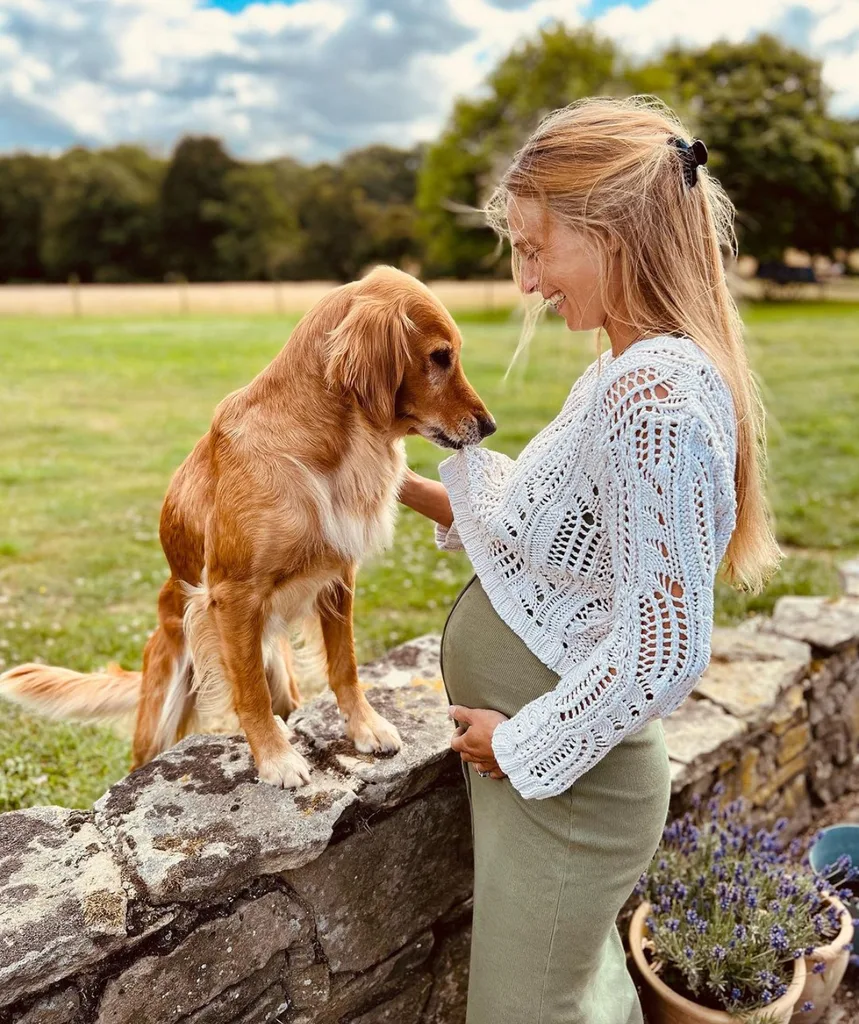 The soon-to-be dad took to Instagram to announce the happy news with a photo of Alizee wearing a stunning olive-green dress which showed her baby bump and their dog Mable looking very excited.