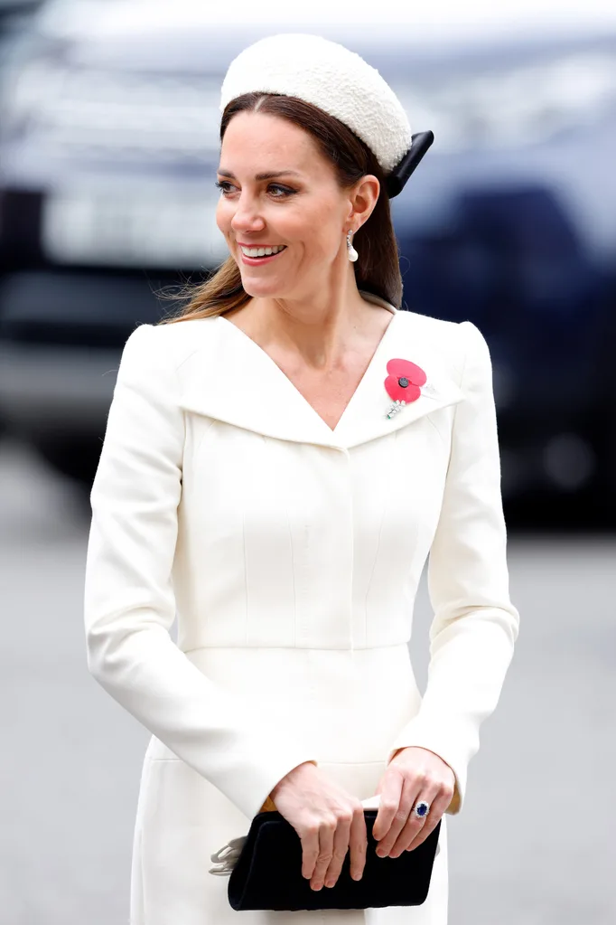 A bright red poppy was pinned to her lapel alongside a sparkling diamond brooch, but it was Catherine’s earrings that caught the attention of royal fans; they were Princess Diana’s iconic Collingwood Pearl Drop Earrings.