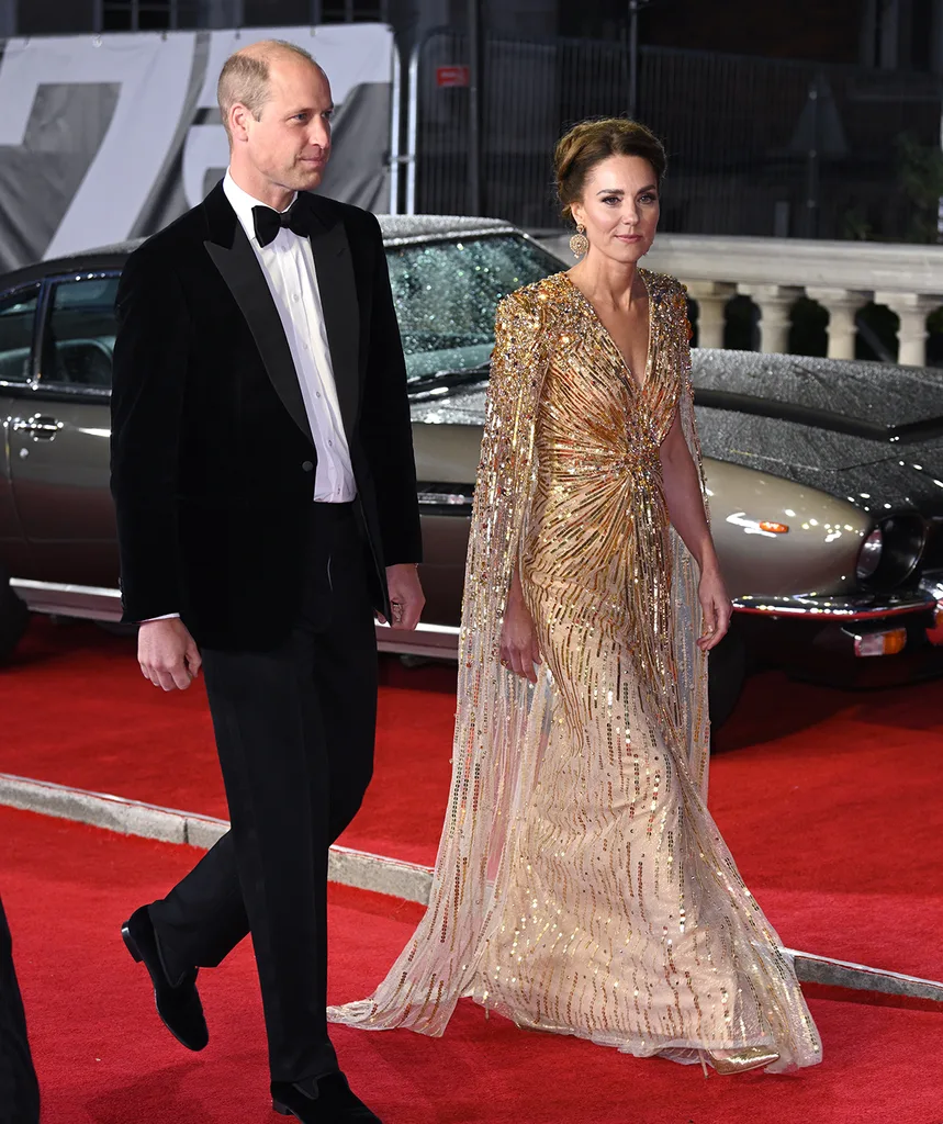 But there was no denying that Catherine stole the show as she channelled her inner ‘Bond girl’ in a glittering, caped frock covered in sparkling gold details.