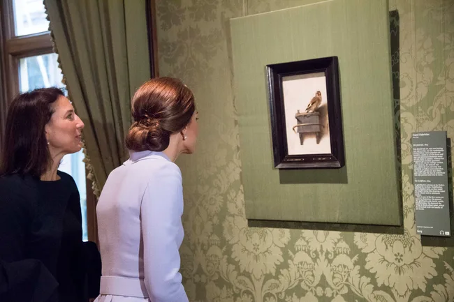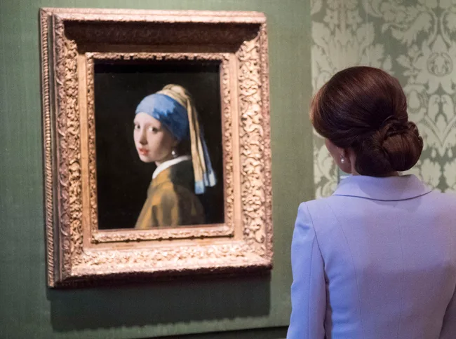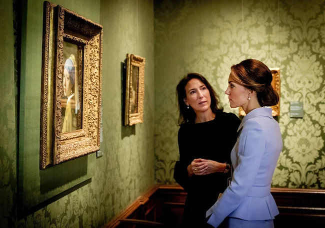 Kate looks at the famous Dutch 17th century painting ‘Girl with a Pearl Earring’ by Johannes Vermeer during her visit to the historic Mauritshuis Museum in The Hague’s city centre.