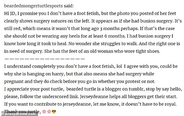 One royal watcher on tumblr, who goes by the name of Jersey Deanne, had obviously been urging the Duchess to have foot surgery to remove the ugly bunion (however one does that on social media) with a poster commenting that, “It does look like she took your advice, JD and fixed her feet.”