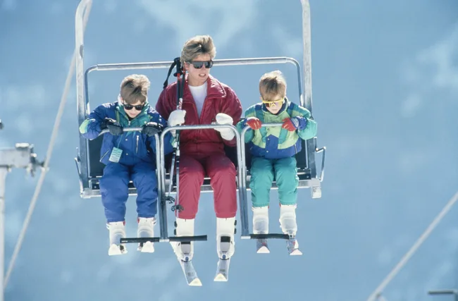 The Princess of Wales takes a family skiing holiday in Lech, Austria, with her sons William and Harry, April 1991.