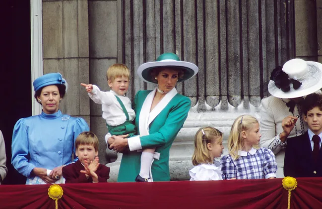 Prince William, Princess Margaret and Diana, Princess of Wales holding baby Prince Harry stand on the balcony of Buckingham Palace following Trooping the Colour on June 1, 1988 in London.