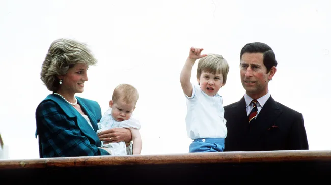 Prince Charles and Princess Diana pose with sons Prince William and Prince Harry on the Royal Yacht Britannia on May 6, 1985 in Venice, Italy.