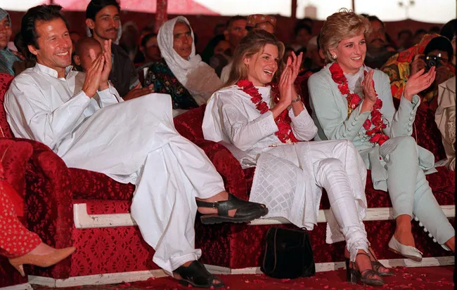 Imran and Jemima Khan sit with Diana, Princess of Wales, during her visit to Pakistan.