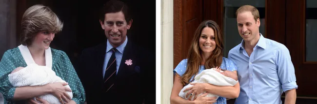 A tribute: Princess Diana and Prince Charles emerge from hospital following the birth of Prince William in June 1982. Decades later Prince William and his wife, Catherine, the Duchess of Cambridge would emerge from the same hospital – Kate also wearing a polka dot dress and William donning a blue button up shirt.