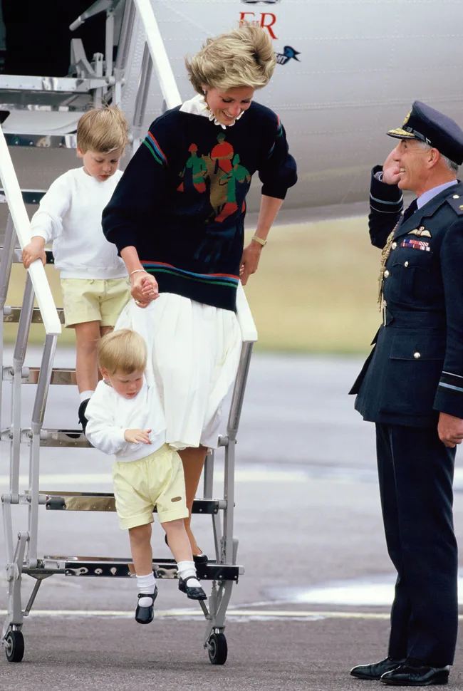 Diana, Princess of Wales, and her young sons Prince William and Prince Harry arrive at Aberdeen Airport in 1986.