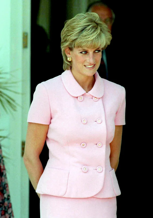 Diana, Princess of Wales wears a pink Versace suit during an official visit to Argentina on November 24, 1995.