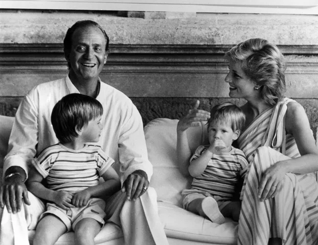 King Juan Carlos 1st of Spain with Diana, William and Harry during a Spanish holiday in 1986.