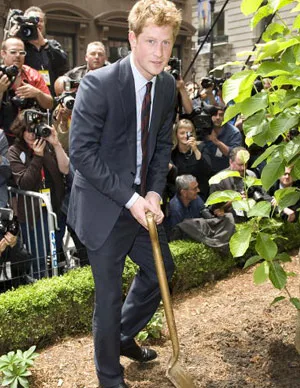 Prince Harry plants a magnolia bush at the The British Garden at Hanover Square as part of the Million Trees NYC initiative.