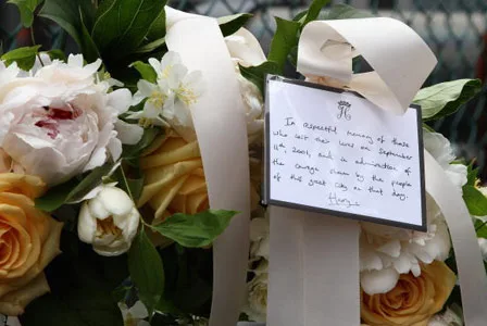 The note on the Prince’s wreath reads: “In respectful memory of those who lost their lives on September 11th, 2001, and in admiration of the courage shown by the people of this great city on that day. — Harry”