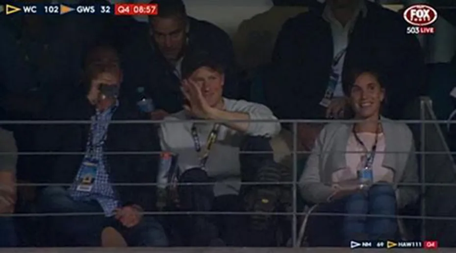 Harry watched the West Coast Eagles secure a solid win against the GWS Giants at Subiaco Oval in Perth on Saturday night, waving to the cameras when they took their lenses off the game to catch the Royal sitting in a corporate box.