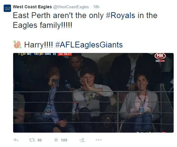 The West Coast Eagles seemed impressed to see the Royal watching them play at their home ground, tweeting: “East Perth aren’t the only #Royals in the Eagles family!”