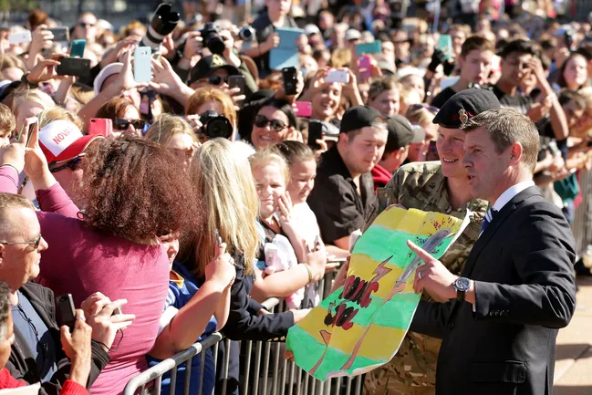 Prince Harry talks to NSW Premier, Mike Baird as the crowd awaits his royal greeting.
