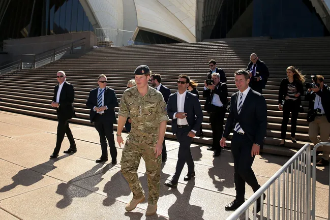 Prince Harry leaves the Opera House with Mike Baird and security.