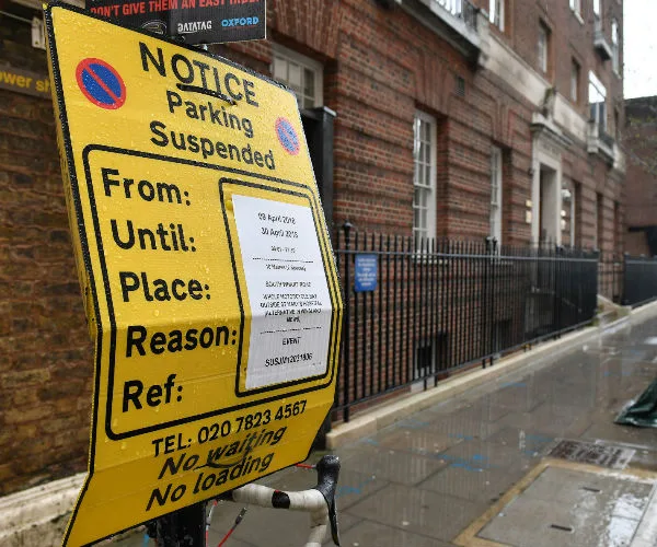Temporary parking restrictions are in place outside the Lindo Wing at the Paddington-based St. Mary’s Hospital, signaling the imminent arrival of royal baby number three.