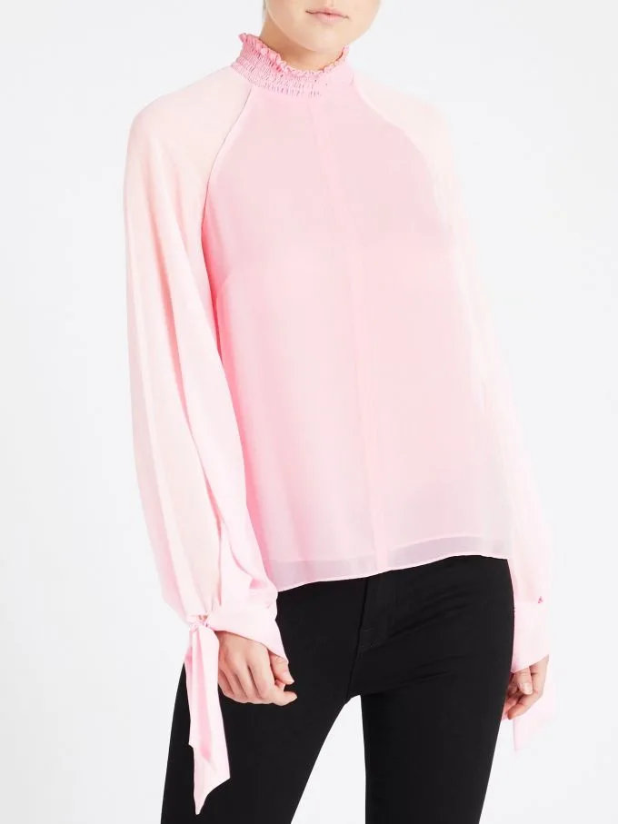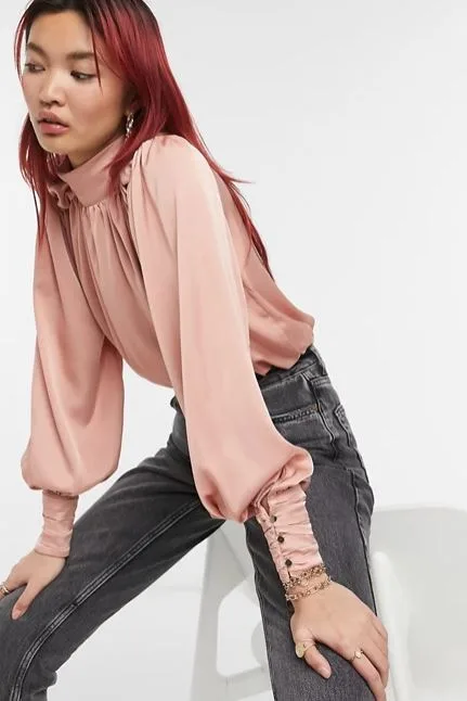 River Island ruched satin high-neck blouse in pink, $64. Buy it online via ASOS here
