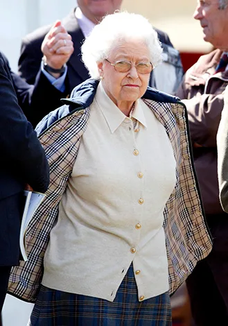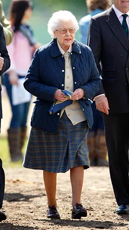 Wearing a cardigan, tweed skirt and navy windbreaker, her appearance was a far cry from anything resembling the Crown Jewels, and she looked more like a local than the reigning Monarch.