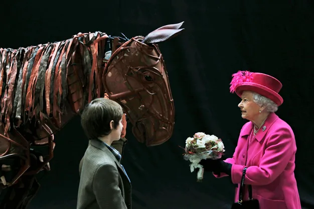 The Majesty receives flowers from a child actor as she inspects the horse prop from the theatre production ‘War Horse’ during a visit to the National Theatre in London in October 2013. Photo: Getty