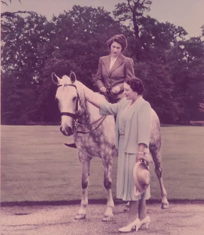 The Queen Mother standing next to Princess Elizabeth who is on a horse at the Royal Lodge in Windsor in England in 1946. Photo: Getty