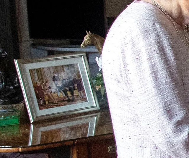 In the photograph, which was spotted by eagle-eyed royal fanatics via a snap taken during an engagement with the Queen last week, the royal great-grandma is seen surrounded by her great-grandchildren.