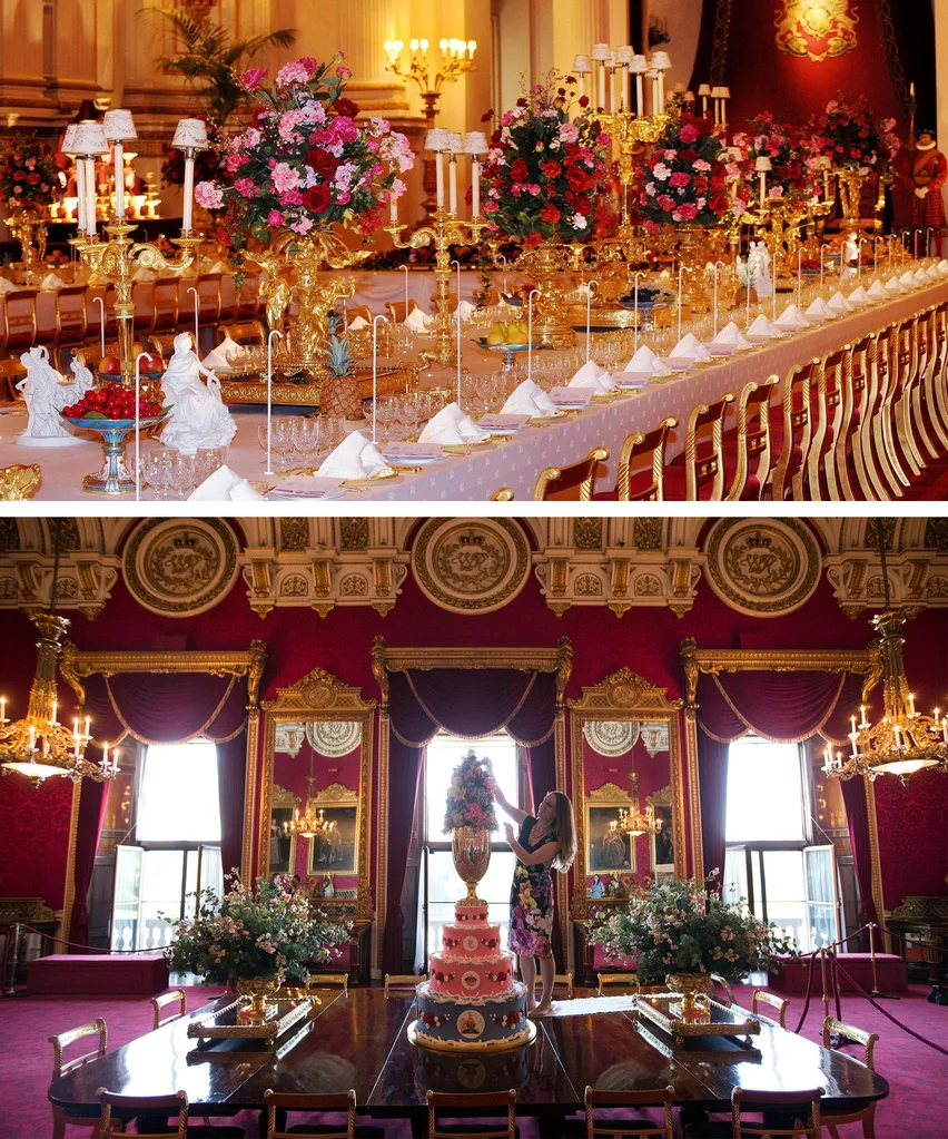 Fit for royalty! The top image is the table laid with the silver-gilt Grand Service and arranged for a State Banquet. While at the bottom, Anna Reynolds, curator of Royal Collection Trust, puts the finishing touches to a display of the 1853 christening cake of Prince Leopold in the State Dining Room of the Palace.