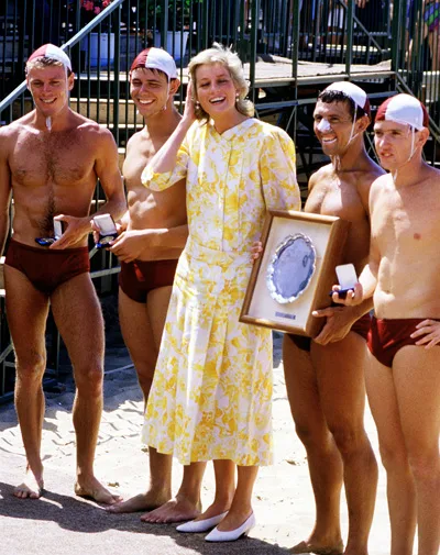 Diana giggles as she meets lifeguards in Terrigal in 1988.