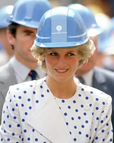 Diana dons a helmet to visit a building site in Canberra in 1985.