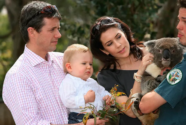Princess Mary, Prince Frederik and their son Christian meet a koala in Hobart in 2006.