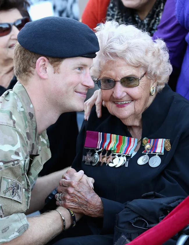 Prince Harry meets Daphne Dunne outside the Sydney Opera House, 2015.
