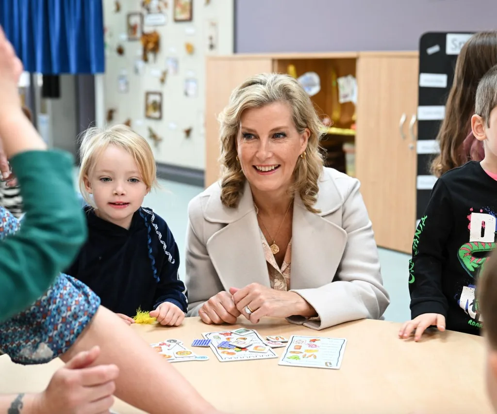 Dressed in a long white-grey coat with a wide collar, and her curly hair neatly resting on her shoulders, the countess visited the new purpose-built early learning and childcare centre at Forfar.