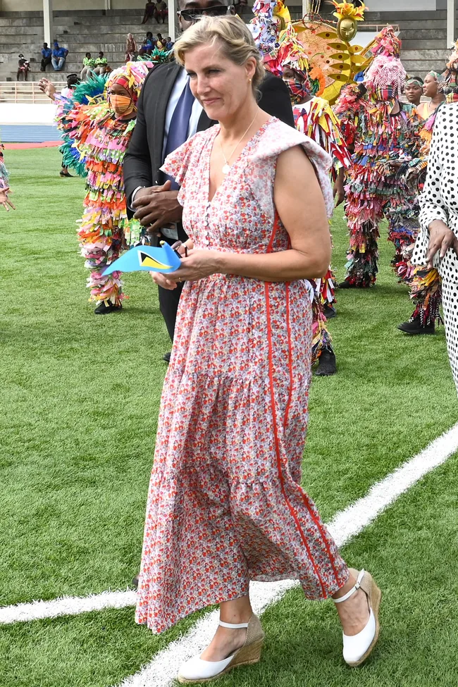 Sophie donned another colourful ME+EM maxi worth $400 on the final leg of her and Prince Edward’s royal tour, pairing it with her favourite white espadrilles.