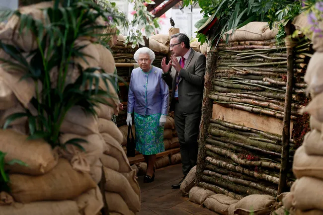 Her Majesty walked through the replica trench created by gardeners for Birmingham City Council, which was complete with sandbags and tiny metal rats.