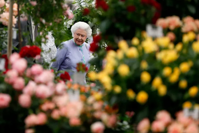 The Queen looked relaxed while enjoying the floral displays.