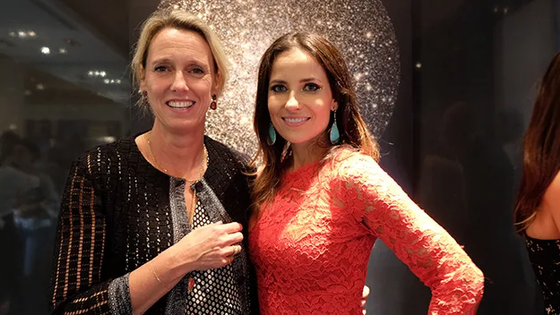 Jewellery designer Annoushka Ducas pictured with artist Roksana Ciurysek-Gedir at an art exhibition in London.