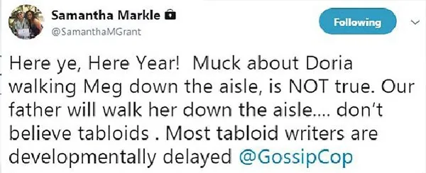 “Here ye, Here Year! Muck about Doria walking Meg down the aisle is NOT true. Our father will walk her down the aisle,” Samantha penned.